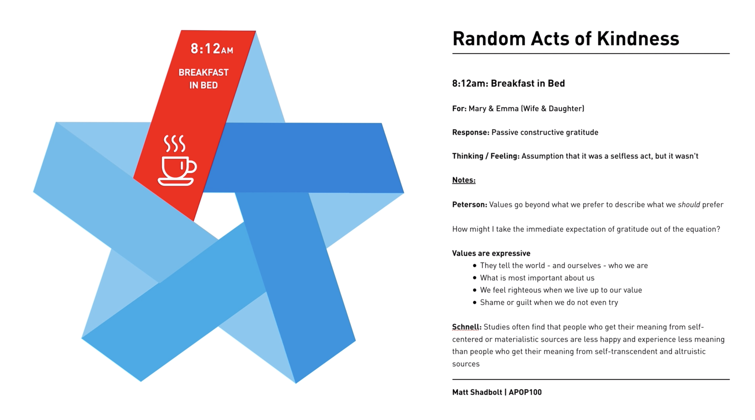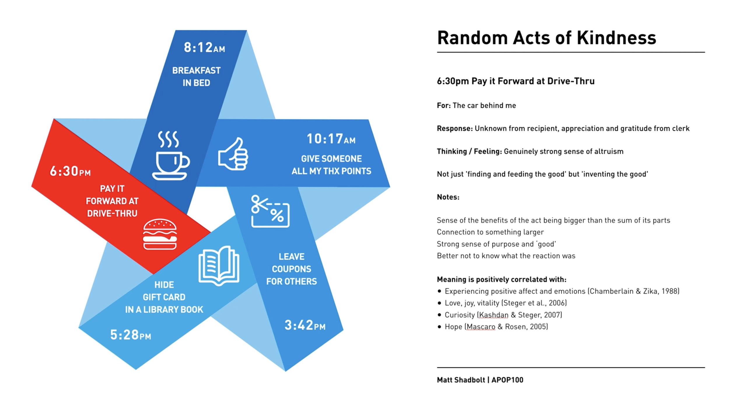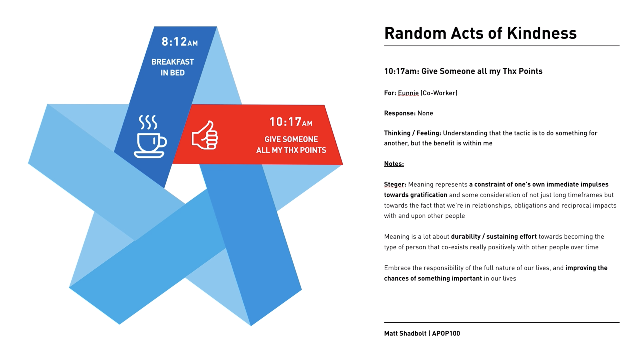 A strong source of meaning in my own life comes from my experience of surviving cancer, and the post-traumatic purpose (Frankl, quoted in Steger, 2018) I continue to feel several years later is very strong in not only taking each day as a gift, but clearly understanding that seeing everything as an opportunity to grow is what makes life rich and worthwhile. My post-cancer journey has led to exponentially stronger degrees of forgiveness, kindness, gratitude, altruism and a genuine love of learning. I am lucky to be here, and for that, I intend to make the most of every positive experience in life.