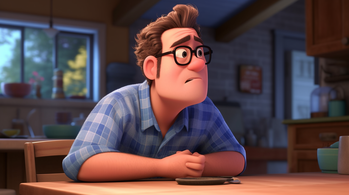 /imagine: Pixar-style slightly chubby 40 year old dad wearing glasses and a blue button-down shirt from the movie Inside Out eating dinner and watching television --ar 16:9