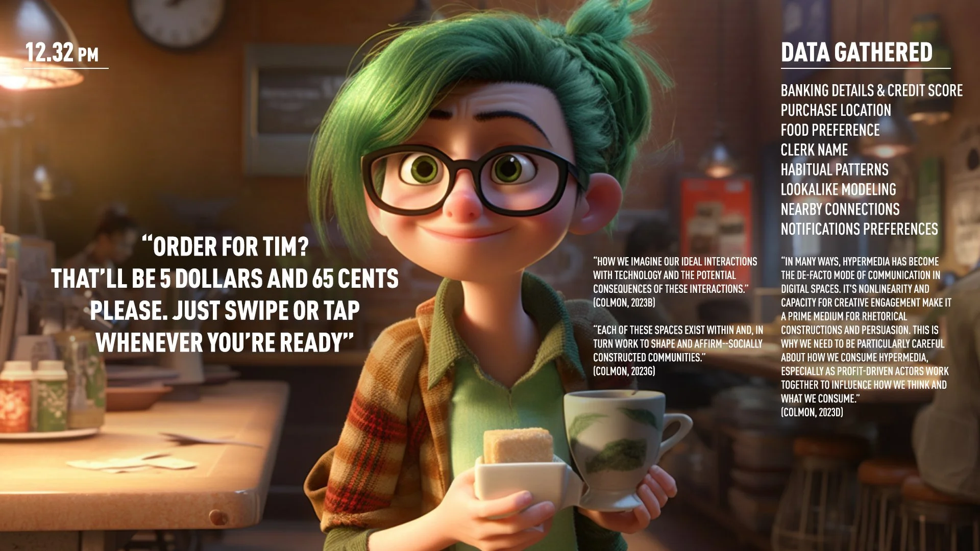 My project will use the language and rhetoric of the digital everyday to surface a conversation about the nature and extent of the data we are sharing simply by being digitally connected. It will be visually shaped through artificial intelligence tools such as MidJourney and ChatGPT, and implement specific sequencing and pathing flows to produce different journeys through the day. I believe that for as much data as we consume through the day, we are also incredibly generous in the information we allow others to gather from us. It will be an open question for users to decide if such a trade is equitable.